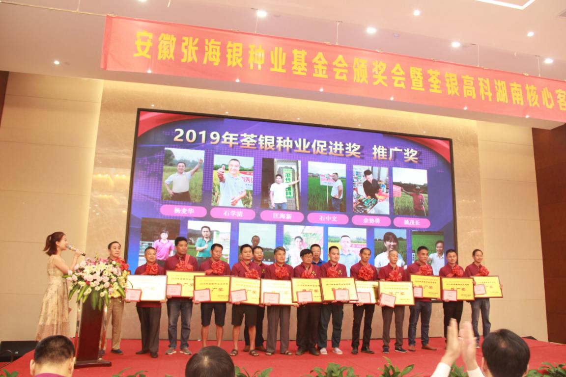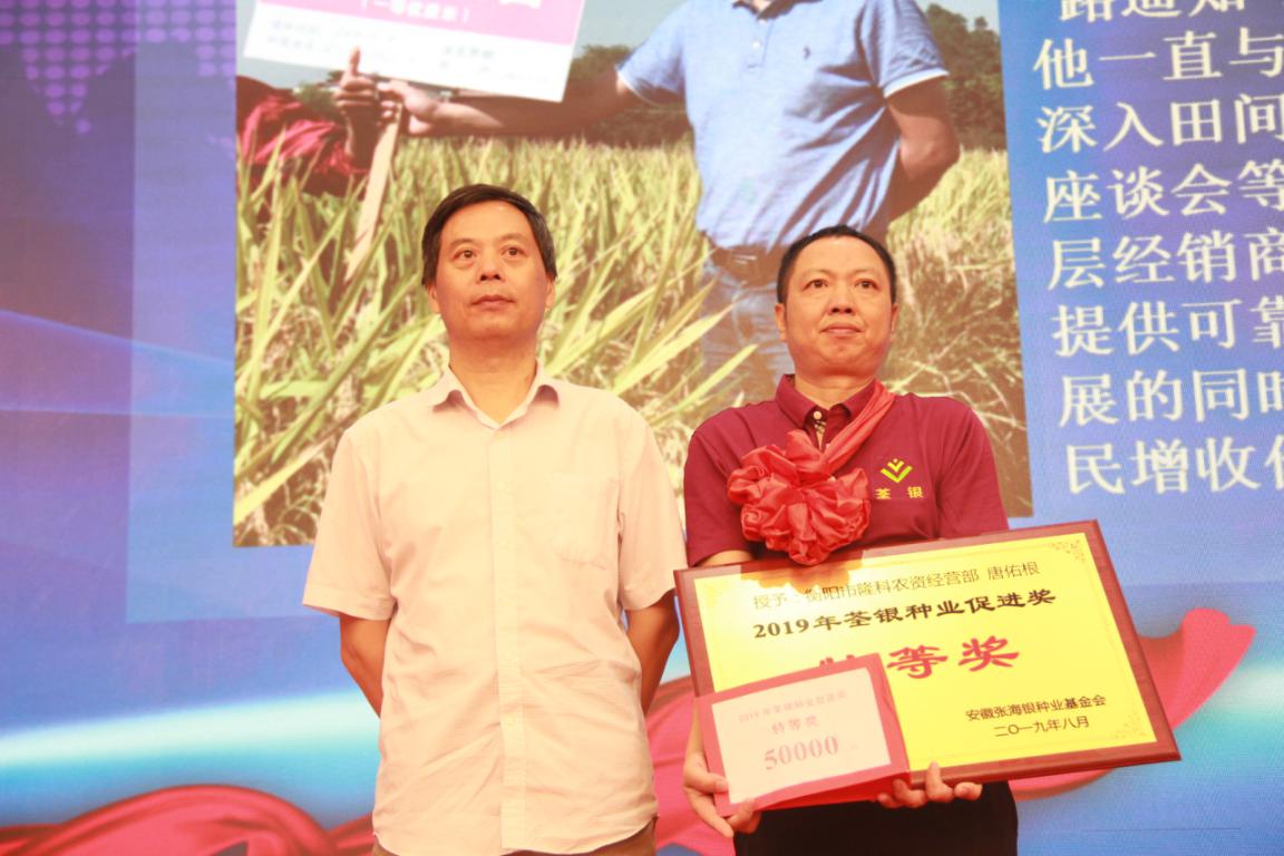 ?? ?隨后,張海銀種業(yè)基金會(huì)鄭滿生監(jiān)事宣讀了張海銀種業(yè)基金會(huì)“荃銀種業(yè)促進(jìn)獎(jiǎng)”2019年頒獎(jiǎng)決定文件。大會(huì)向38名在優(yōu)質(zhì)水稻推廣和良種服務(wù)等方面取得優(yōu)異成績(jī)的個(gè)人頒發(fā)了“荃銀種業(yè)促進(jìn)獎(jiǎng)”專(zhuān)項(xiàng)獎(jiǎng)。